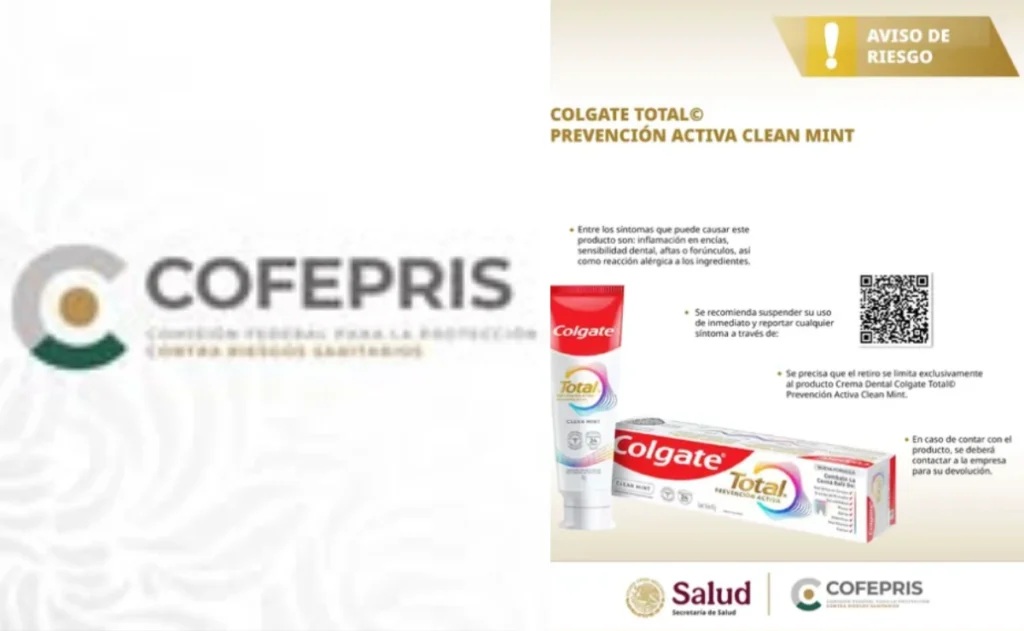 La Comisión Federal para la Protección contra Riesgos Sanitarios (Cofepris) ha emitido una alerta sanitaria nacional para retirar del mercado la Crema Dental Colgate Total Prevención Activa Clean Mint