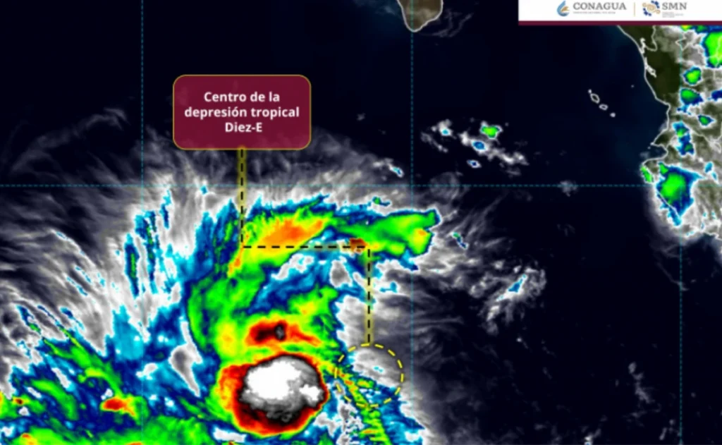 De acuerdo con el Servicio Meteorológico Nacional (SMN), se formó un nuevo sistema en el pacífico. La depresión tropical Diez-E se ubica a unos 625 kilómetros al suroeste de Playa Pérula, Jalisco, y a 765 kilómetros al sur de Cabo San Lucas, Baja California Sur. Sus vientos sostenidos alcanzan los 55 km/h con rachas de hasta 75 km/h, desplazándose hacia el oeste-noroeste a una velocidad de 22 km/h.